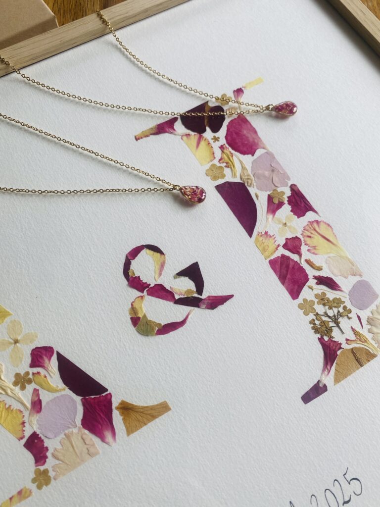 Quel que soit le style choisi, l’herbier devient bien plus qu’un simple souvenir, c’est un objet décoratif plein de poésie, une trace vivante du jour J. Chaque pièce est réalisée de manière 100% artisanale, avec patience et minutie. J’y dépose autant d’amour que vous en avez mis dans le choix de vos fleurs pour faire durer l’émotion dans le temps.